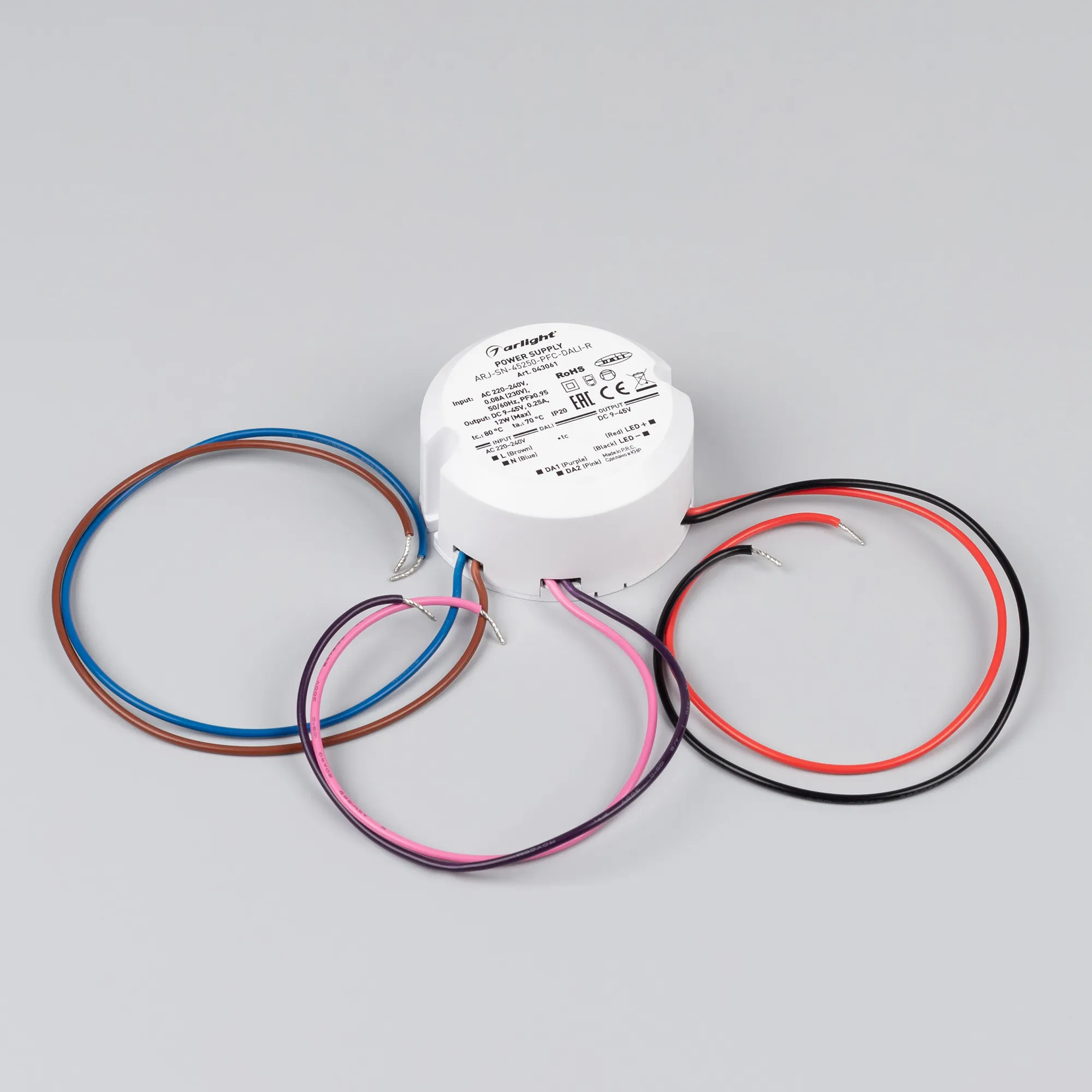 Диммируемый источник тока по протоколу DALI с гальванической развязкой для светильников и мощных светодиодов. Входное напряжение 220-240 VAC. Выходные параметры: 9-45В (250мА), максимальная мощность 12 Вт. Встроенный PFC >0,95. Негерметичный пластиковый корпус IP 20. Габаритные размеры диаметр в окружности Ø56,5 мм, высота 28 мм. Гарантийный срок 3 года.