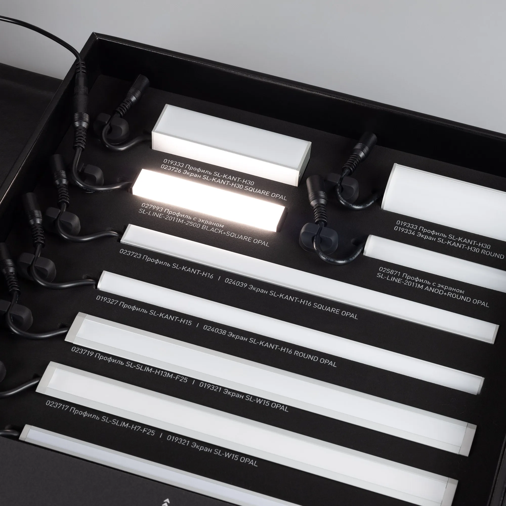 Демонстрационный набор обновлённых профилей серий SL-LINE-2011, SL-KANT-H16/H30, SL-SLIM/SLIM20, SL-MINI-8. Включает отрезки профиля с экраном и заглушками по 20см со светодиодной лентой 24В. Также в комплекте блок питания.