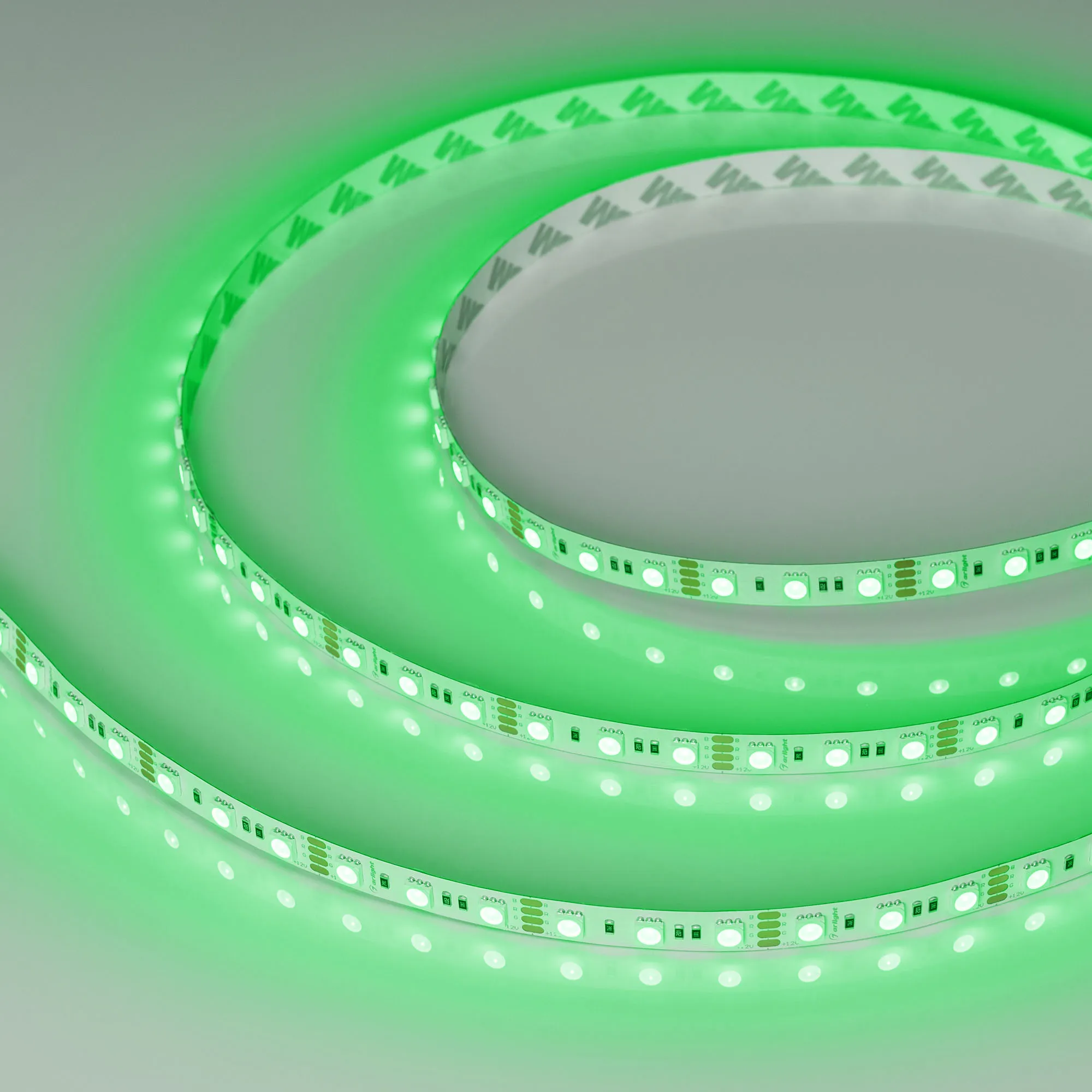Мультицветная светодиодная лента RT серии B72. Светодиоды SMD 5060, 72 шт/м (360 шт на 5 м), белая плата шириной 10 мм, скотч 3M. Цвет RGB, угол 120°. Питание 12 В, мощность 15 Вт/м (75 Вт на 5 м). Размеры 5000x10x2.2 мм. Мин. отрезок 41.7 мм, 3 светодиода. Цена за 1 м.