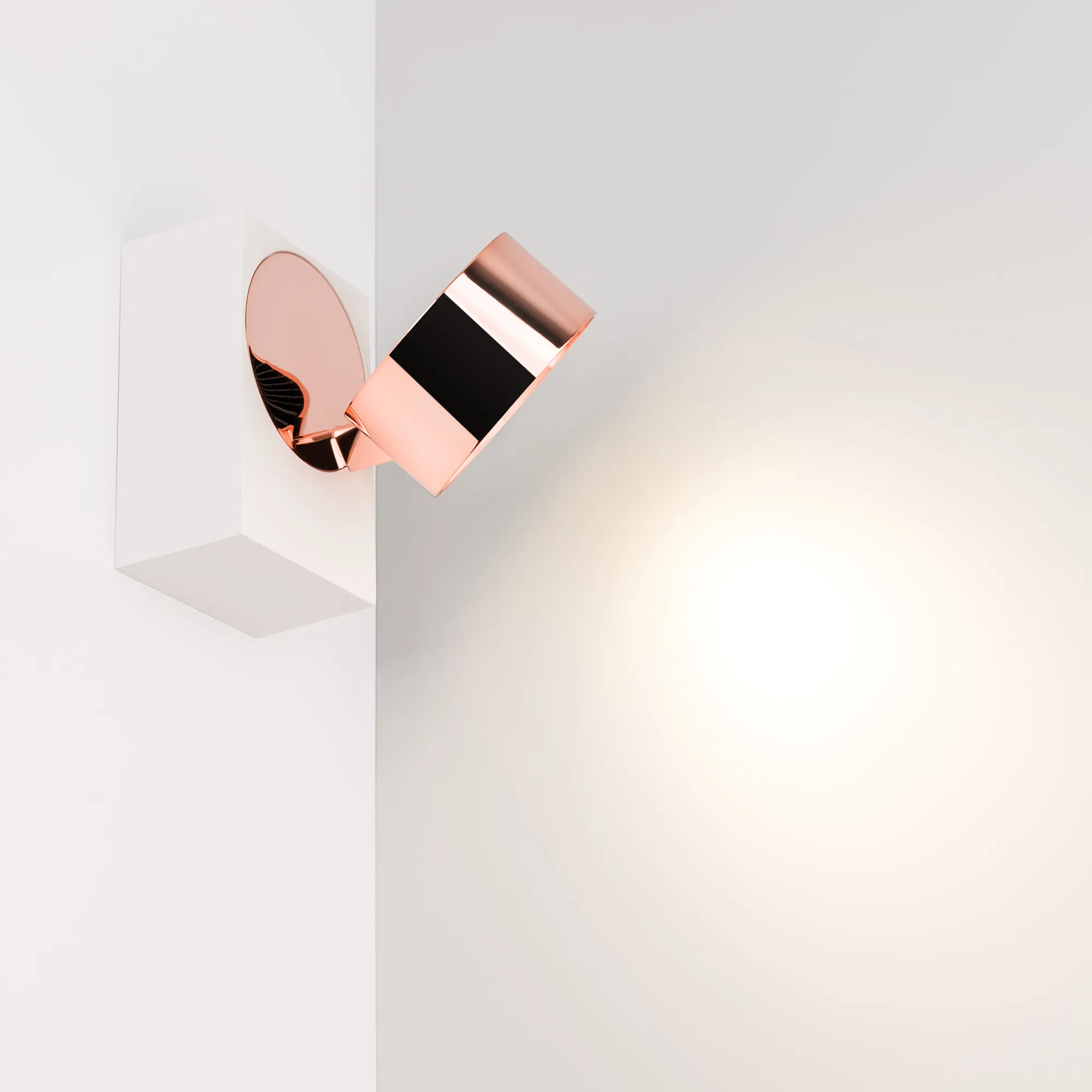 Светильник накладной поворотный. Мощность 9 Вт, св. поток 600 лм, 67 лм/Вт, дневной 4000 K, CRI>90, угол 36°, напряжение питания 230 В. Модуль Цвета Медь, Белый прямоугольный корпус из алюминия, экран поликарбонат, степень защиты IP20. Размер: длина 110 мм, ширина 77 мм, высота 93 мм. Монтаж накладной. Драйвер 38 В, 200 мА, пульсация <1%.
