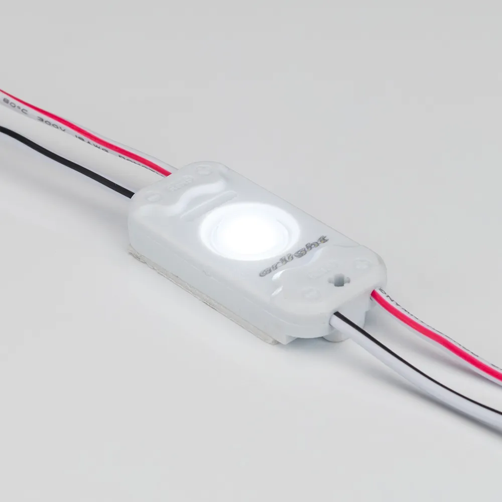 Светодиодный модуль с линзами 160°, 1шт LED smd 2835 (новый тип), литой корпус IP65. Цвет БЕЛЫЙ 6500-7000К, световой поток 50 люмен. Питание 12V DC, мощность 0.54 Вт. Габариты 37.9*16.5*7.9 мм. Длина провода между модулями 90 мм, Расстояние между центрами модулей 128мм, 50 шт на проводе. Рекомендуемая глубина установки 80-200мм Гарантийный срок 5 лет.