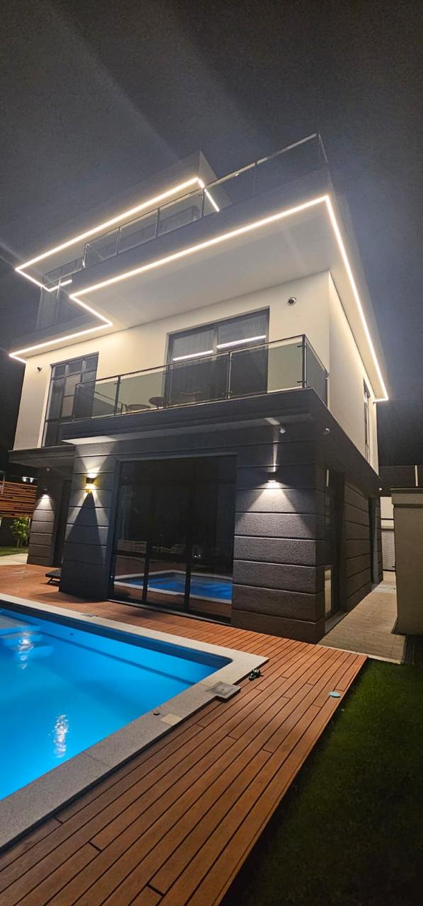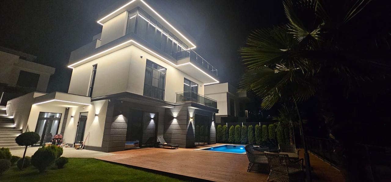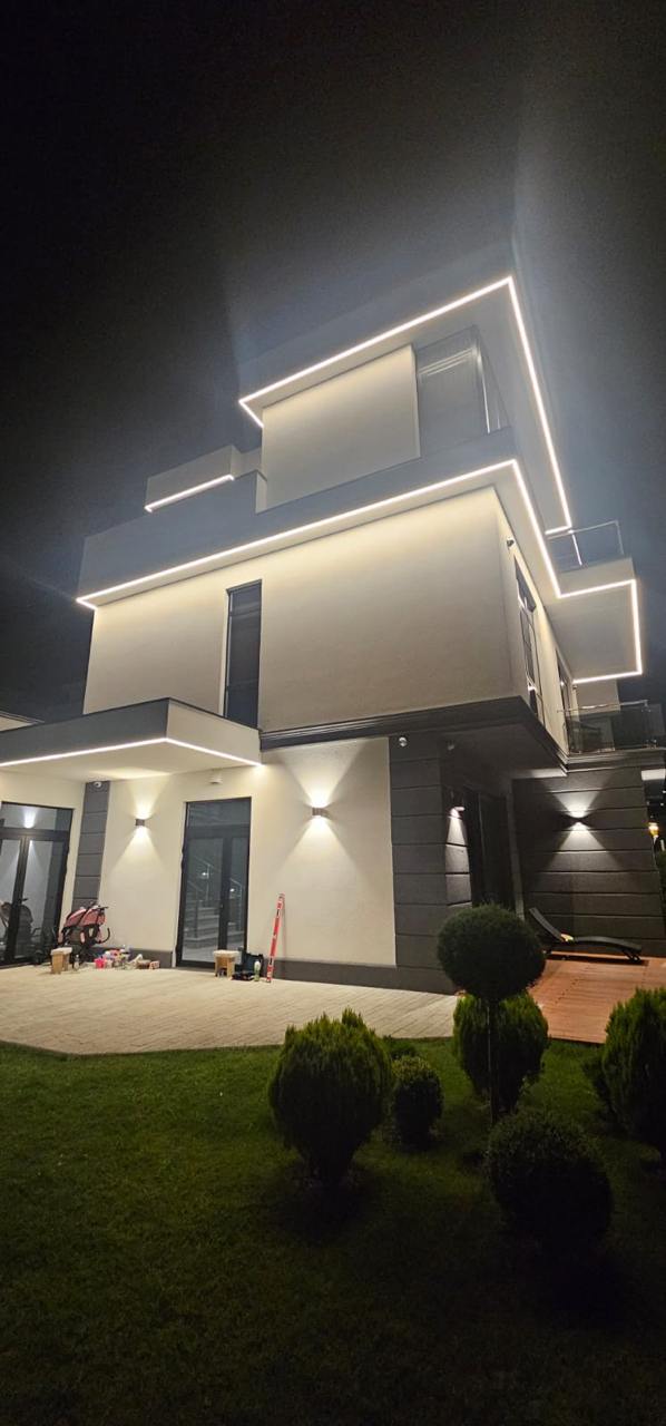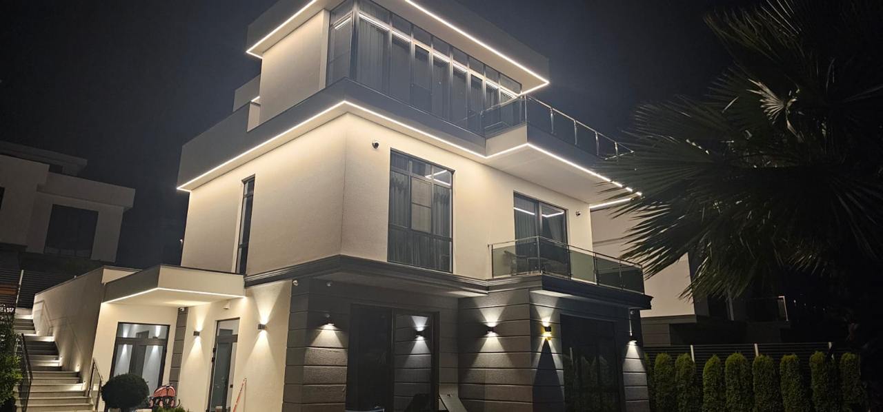 Контурная подсветка дома выполнена герметичной светодиодной лентой серии RTW с высокой степенью пылевлагозащиты. А также тонкие профили S-LUX с матовым рассеивателем из поликарбоната со светопропусканием 63%, который равномерно рассеивает свет, размывая точки светодиодов на поверхности, и обеспечивает надежную защиту светодиодной ленты от воздействия внешних факторов, таких как грязь и пыль.