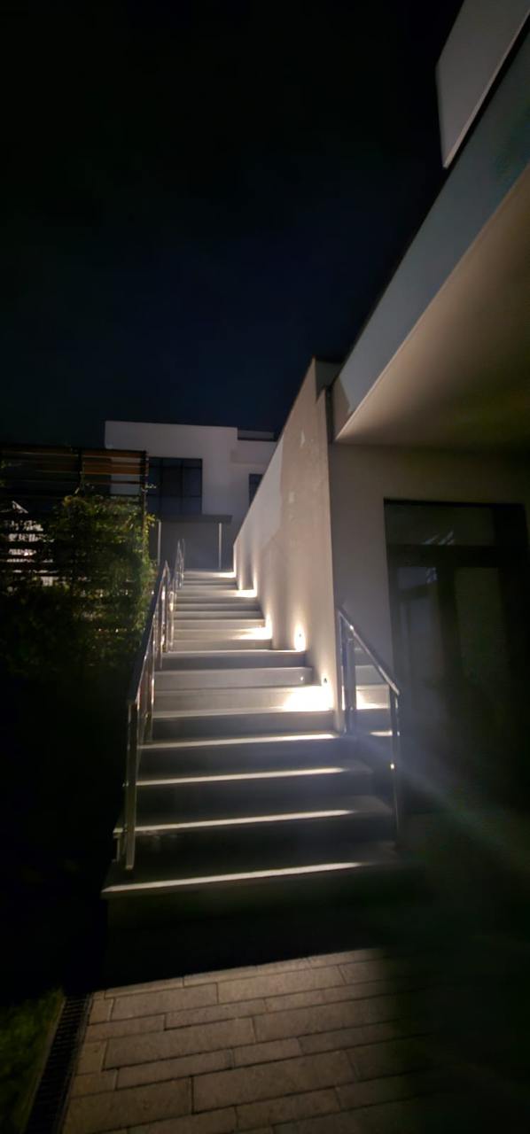 Для подсветки лестниц используется встраиваемый светильник серии LTD-TRAIL с асимметричным светораспределением мощностью 4 Вт, теплого цвета свечения (3000К) отличается компактным размером и небольшой глубиной встройки.  Корпус светильника изготовлен из алюминия, окрашенного порошковой краской в черный цвет, рассеиватель надежно скрыт внутри корпуса.